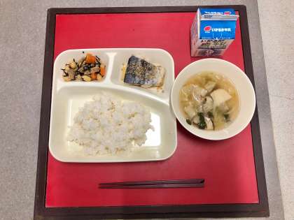 11月1日(火)の献立は「ごはん・牛乳・さごしのごまじょうゆかけ・五目汁・大豆の煮もの」でした。