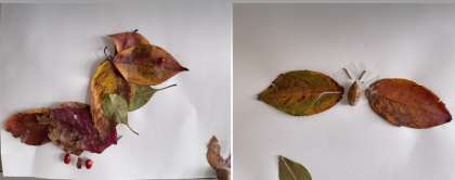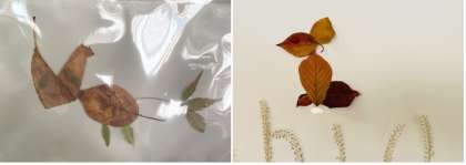 どんぐり・紅葉した葉っぱ・えだなど自然のものを使って、遊び道具や飾りを作りました。