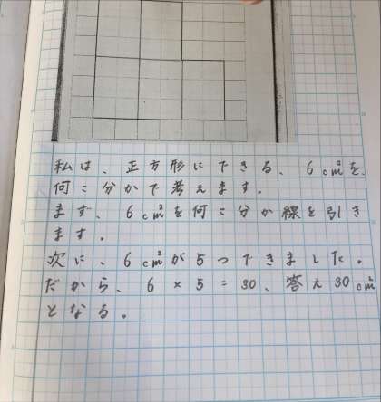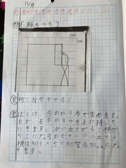 長方形や正方形の求め方を確認し、複雑な図形の求め方について考えました。積極的に問題に取り組む姿が見られ、2つ以上求め方を書いている子どももいました。求め方を説明する際も分かりやすく説明し、納得して拍手が起こる求め方もありました。