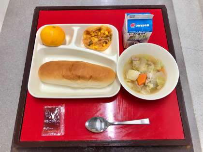 11月10日(木)の献立は「コッペパン(いちごジャム)・牛乳・豚肉と野菜のスープ煮・変わりピザ・みかん」でした。