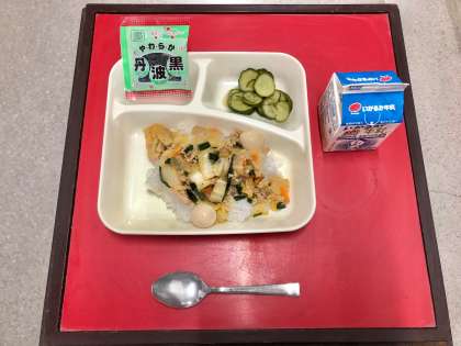 11月15日(火)の献立は「中華丼<うずら卵の個別対応献立>・牛乳・きゅうりのピリ辛あえ・ソフト黒豆」でした。