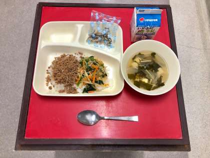 11月30日(水)の献立は「ビビンバ・牛乳・わかめスープ・アーモンドフィッシュ」でした。