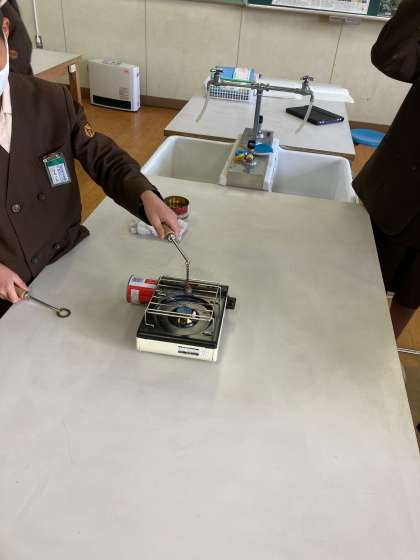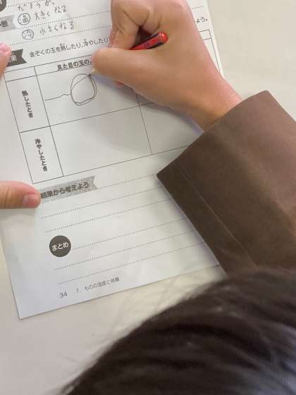 金属は、温度によって体積が変化するのかを学習しました。理科室で実験をしている様子です。火を使っての実験ということもあり、子どもたちも集中して取り組んでいました。金属球を熱する前と熱した後の変化について、子どもたち自身でまとめることができました。