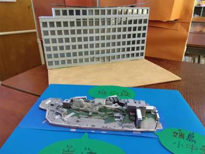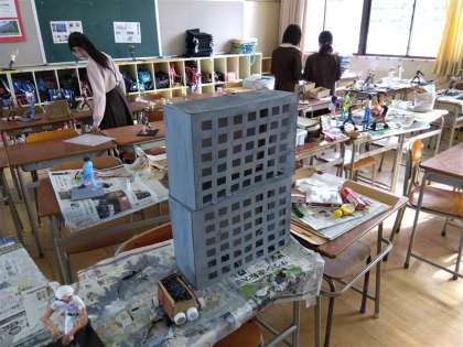 展示する端島小中学校や団地も、みんなで製作中です。