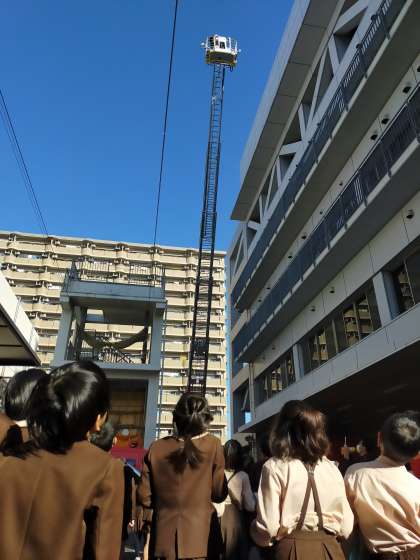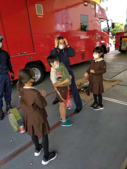 25日に消防署へ行ってきました。実際にホースを持たせていただいたり、はしごの長さを近くで見たりすることができました。消防士さんの話を聞いて、いつでも命令が出たら一分で出動できるようにしているなんてすごい!という声があがっていました。鶴見消防署の皆さん、ありがとうございました。