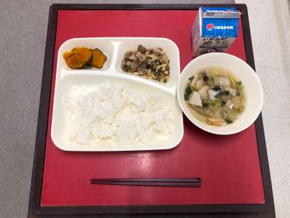 12月5日(月)の献立は「ごはん・牛乳・豚肉と干しずいきのみそ煮・うすくず汁・焼きかぼちゃの甘みつかけ」でした。