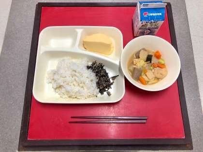 12月8日(木)の献立は「ごはん・牛乳・卵どうふ・一口がんもと野菜の煮もの・魚ひじきそぼろ」でした。