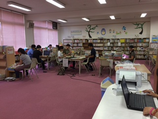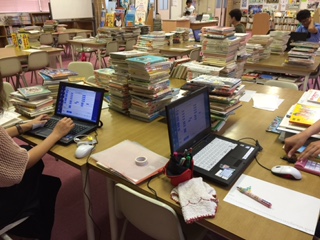 バーコード化作業は、教職員が手分けしてパソコンを使って進めています。全部で約10,000冊ありますが、夏休み中に作業を終了して、2学期から貸し出しに活用できるようにしたいと思います。