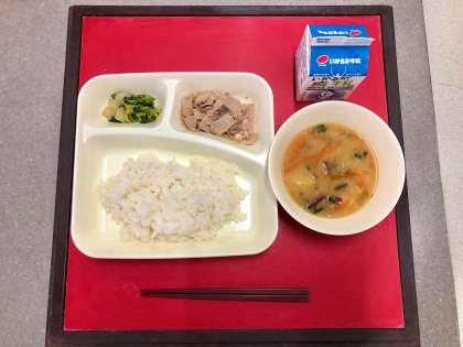 12月15日(木)の献立は「ごはん・牛乳・豚肉のしょうが焼き・さつまいものみそ汁・きくなとはくさいのごまあえ」でした。