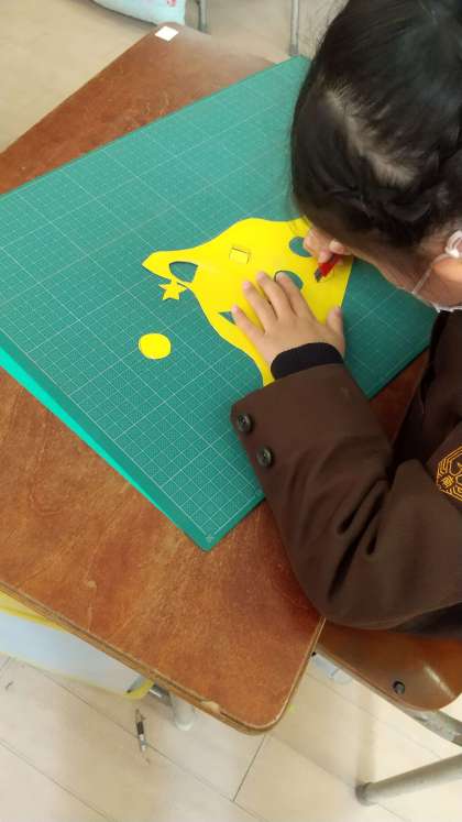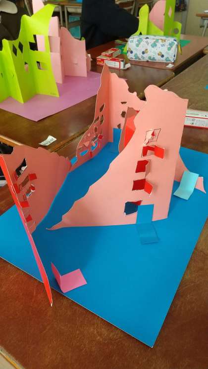 2年生【図画工作科】の学習では、カッターを使って「まどのあるたてもの」を作っています。カッターの使い方を学習した後、色画用紙にカッターでまどや模様を入れて、切っていきます。初めは難しかったカッターの使い方も、だんだん上手になってきました。飾りをつけると出来上がりです。