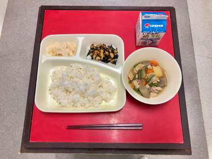 12月22日(木)の献立は「ごはん・牛乳・鶏肉と野菜の煮もの・ひじき豆・かぶのゆず風味」でした。