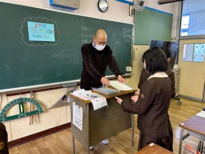 ※写真は子どもたちに担任から通知表を渡す様子です。