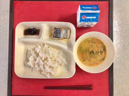 1月23日(月)の献立は「ごはん・牛乳・さごしのしょうゆだれかけ・みそ汁・黒豆の煮もの」でした。