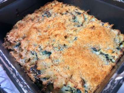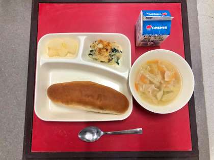 1月24日(火)の献立は「黒糖パン・牛乳・ほたて貝のグラタン・スープ・和なし(カット缶)」でした。