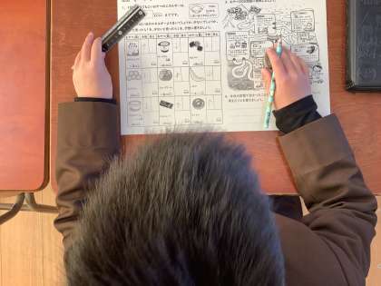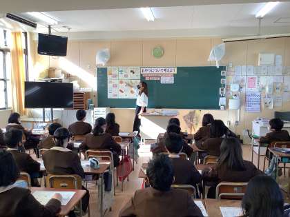 今回はおやつについて考えました。1日に食べてもよいおやつのエネルギー量を知った後、おやつの成分「おやつSOS」について学習しました。