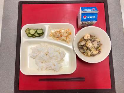 2月6日(月)の献立は「ごはん・牛乳・すき焼き煮・もやしとささみのいためもの・きゅうりのゆず風味」でした。