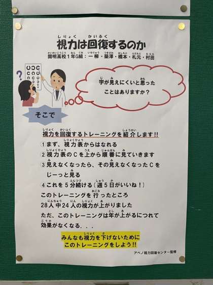 本校を4年前に巣立った生徒が、進学先の高校で研究したことを伝えに来てくれました。視力の低下の予防には、低学年の時期から取り組むことが大切だそうです。1年生の子どもたちは楽しそうに視力チェックに取り組んでいました。ポスターを玄関に掲示していますので、来校の際はご覧ください。