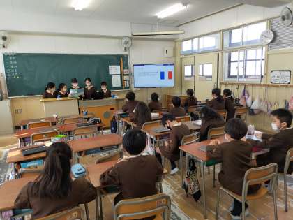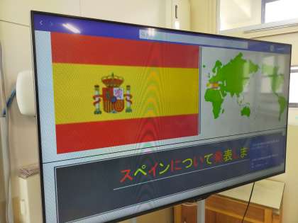 外国について自分たちで調べ、どのようにすれば相手に伝わるか、必要な情報はどれかを考えました。3組ではPowerPointを使って資料を作り、発表しました。みんなの前に立ち、堂々と発表をしていました。