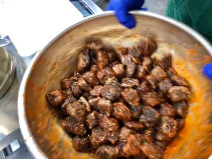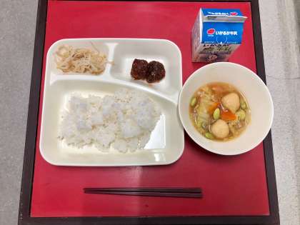 2月20日(月)の献立は「ごはん・牛乳・くじらのオーロラ煮・まる天と野菜のうま煮・もやしのピリ辛あえ」でした。
