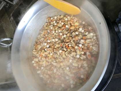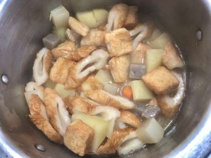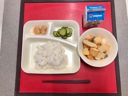 2月21日(火)の献立は「ごはん・牛乳・関東煮【個別対応献立(うずら卵)】・きゅうりの梅風味・白花豆の煮もの」でした。