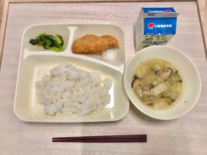 2月24日(金)の献立は「ごはん・牛乳・たらフライ・すまし汁・こまつなのごまあえ」でした。