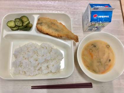 3月1日(水)の献立は「ごはん・牛乳・いわしフライ・みそ汁・きゅうりの赤じそあえ」でした。