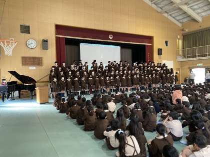 卒業を来週にひかえた6年生が、在校生に向けて平和への取組を報告してくれました。集会の最後には平和の子の像の前でも歌った「ヒロシマのある国で」を合唱し、在校生に聴かせてくれました。平和の取組については、今後も学校全体で継続して取り組んでいきます。