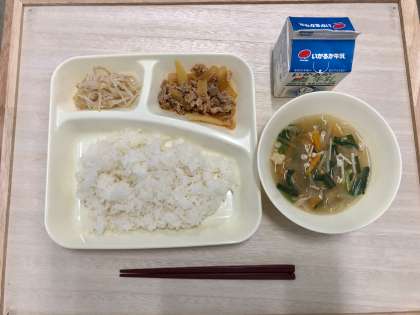 3月22日(水)の献立は、「ごはん・牛乳・豚肉のコチジャンいため・鶏肉とはるさめのスープ・もやしのナムル」でした。