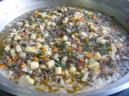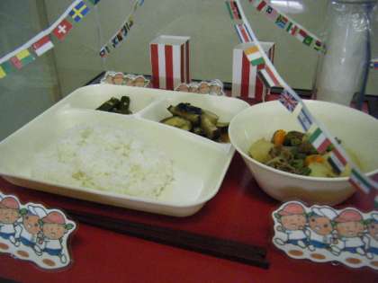 肉じゃがは牛肉を主材にじゃがいも、たまねぎ、にんじんなどが入った児童に人気の献立です。