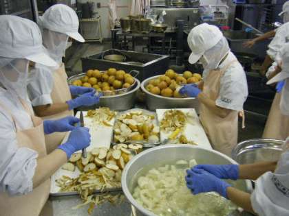 なし(豊水)は佐賀県産のもで1人1/4個で芯を取り提供しました。(2年生はさらに皮を取り、1年生は皮を剥き、1/8個をふたつ付けにしました。)
