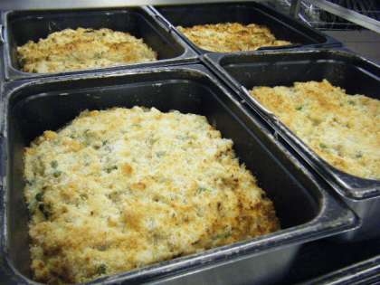 グラタンは毎回児童に大変人気の献立です。マカロニ・えびを主材に、からいりした小麦粉・牛乳などを合わせ、パン粉・チーズをふりかけ、蒸し焼きにした献立です。