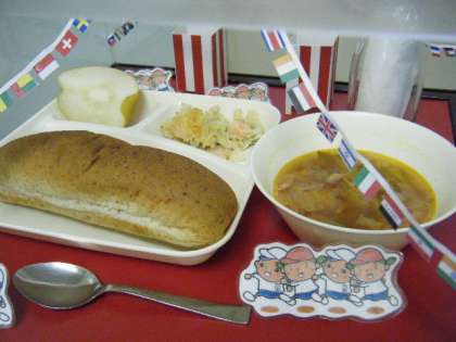 本日の献立は「えびグラタン・トマトスープ・なし(豊水)・パン・牛乳」でした。