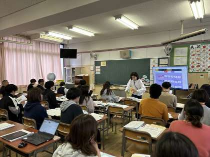 今日の放課後は先生方の研修会がありました。来月から始まるTET(つるなんイングリッシュタイム)に向けて、先生たちで情報を共有したり、先生役と子ども役に分かれてお手本の授業を受けたりしました。よりよい授業づくりのために、先生たちも頑張っています。
