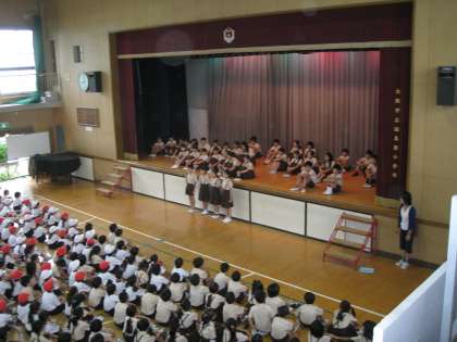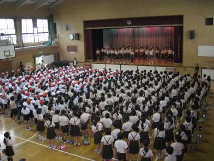 その後、児童会代表委員が前に出て「今年の運動会のテーマは、輝け☆友情に決まりました」ということと、「来週からあいさつ週間が始まります。テーマはハッピースマイルです。みんなで気もち良くあいさつしましょう。」ということを伝えました。
