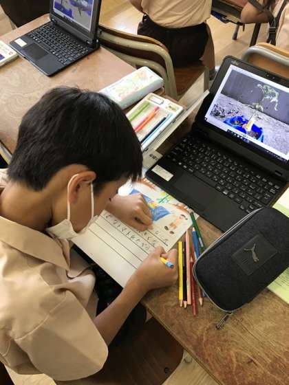 一人一台端末を活用して植物の観察日記に取り組んでいます。