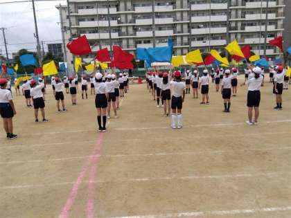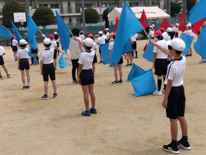 いろいろなフラッグの振り方や場所の移動を覚えつつ、動きをそろえる練習をしています。