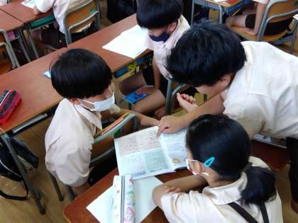 【1】子どもたちが教科書を読み、どの内容が重要なのかを話し合う。