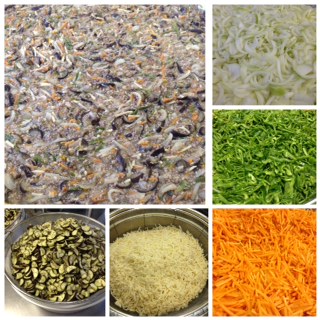写真上段はマーボーなすに使用された野菜や、出来上がりの様子です。なすは量が多いので、学校給食では一度茹でてから炒めるようにしています。
