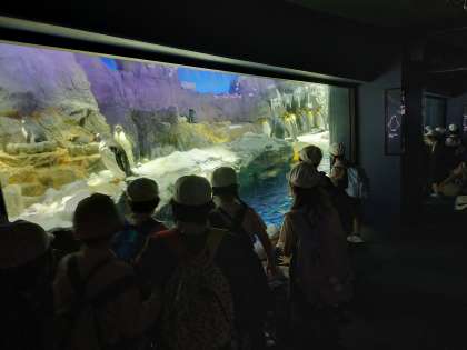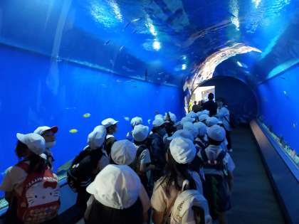 3年生は、春の遠足で海遊館へ行きました。大きな水槽を前に「うわぁ!」という声が聞こえてきました。子どもたちは、ジンベイザメやペンギン、イルカなど、たくさんの海の生き物たちが、えさを食べている姿や泳いでいる姿をよく見ていました。お弁当は、あいにくの雨で外では食べられませんでしたが、友だちと一緒においしいお弁当を食べて嬉しそうな姿を見ることができました。