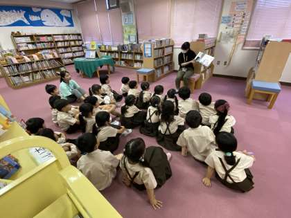 図書では、本の読み聞かせをしてもらっているところです。真剣に聞き、物語の世界に入り込んでいます。