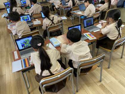 生活科では、あさがおの観察をタブレットで行いました。子どもたちは、写真を拡大し、葉に毛があることや、葉脈の色が葉の色と違うことなど、いろんなことに気付く姿が見られました。