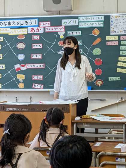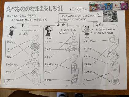 12日の月曜日、みどり小の栄養教諭喜多先生と茨田南小の栄養教諭桑野先生による栄養指導がありました。「たべもののなまえをしろう」というめあてで、色々な食べ物の名前について確認しました。また、黄、赤、緑の食べ物のはたらきについても教えていただきました。12日の給食にも、黄、赤、緑の食べ物がたくさん入っていることを知って、おどろいていました。