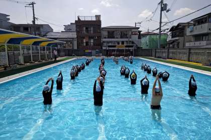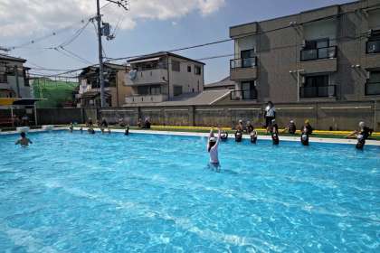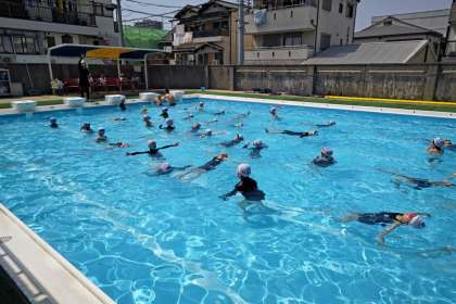 プール水泳学習が始まりました。体の力をぬいてプカプカと浮いたり、水の中へもぐったりして、水になれる運動をしました。そのあとは、腕をぴんと伸ばしてふし浮きやけのびをしました。