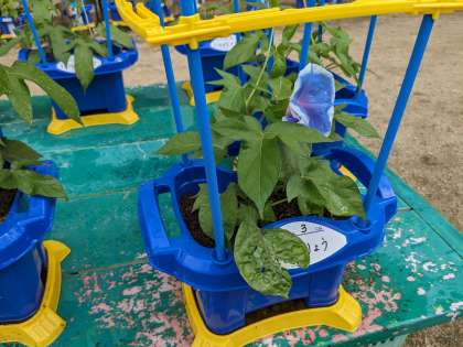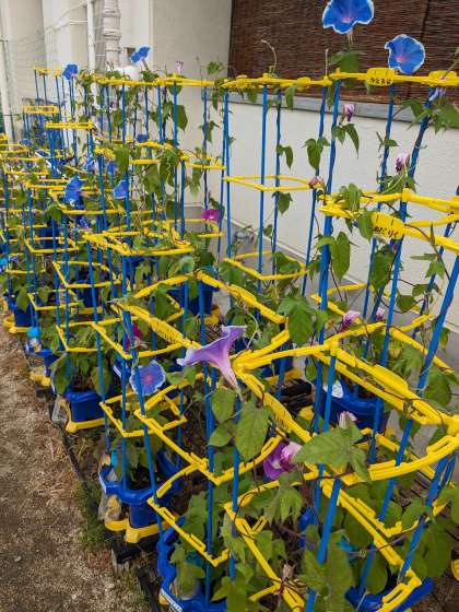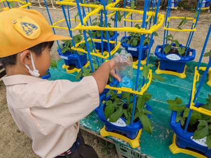 1年生では、生活科の学習で朝顔を育てています。毎日、水やりを頑張っています。つるも伸びて、花もだんだん咲くようになってきました。種ができるまで、引き続きお世話をがんばります。