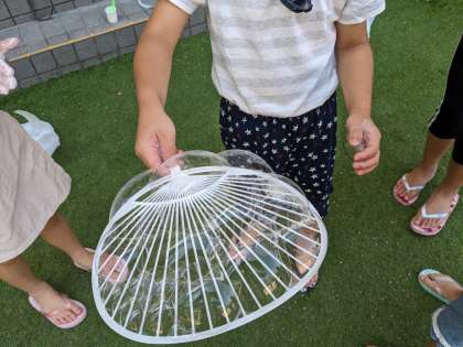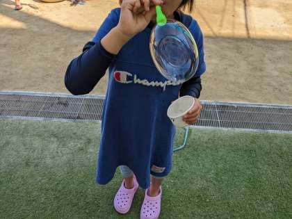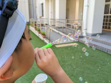 1年生は、生活科の学習で「シャボン玉あそび」をしました。キラキラ光るシャボン玉を見て、みんな笑顔になっていました。