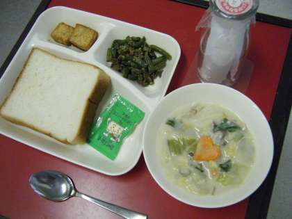 本日の献立は「はくさいのクリーム煮・あつあげのしょうがじょうゆかけ・牛肉と三度豆のごまいため・パン・牛乳」でした。