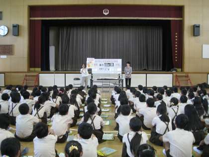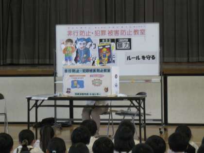 次にパネルシアターで、万引きは犯罪の第一歩であるというお話がありました。つい出来心でした万引きから、警察のお世話になり、それを知らされた家族も大変悲しい思いをすることになるというものです。5年生の子どもたちは真剣な表情で聞いていました。