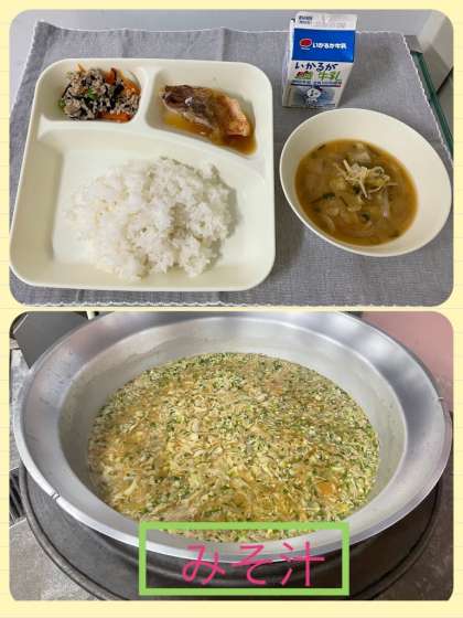 給食のいり煮は、豚ひき肉・にんじん・ひじきを炒め、だしを加えて砂糖やしょうゆなどで味付けし、高野どうふの粉末を加えて調理したものです。