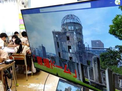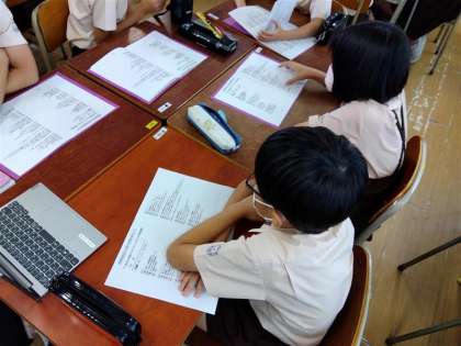 児童が考えた「平和メッセージ」を、どのように読んで発表するかを話し合っています。
