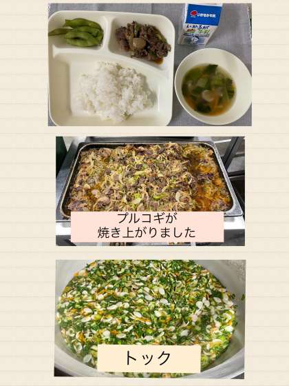 プルコギは韓国・朝鮮の料理で、「プル」は「火」、「コギ」は「肉」という意味で、合わせて「火で焼いた肉」といいう意味にまります。児童に人気の献立です。